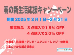 おもろやでは春の新生活応援キャンペーンを開催致します。期間と詳細は下記の通りとなります。 期間 2025年3月1日〜2025年3月31日までセール対象 家電3点購入で15%OFF 4点購入で20%OFF 冷 […]