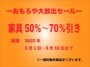 春の新生活応援キャンペーンに伴い家具製品も大放出セールを行います。 ベッドやタンス、チェスト、テーブルなどの大型家具を値札よりレジにて50%〜70%の値引きで販売致します。 ※ 一部対象外の商品もございます。 この機会に […]
